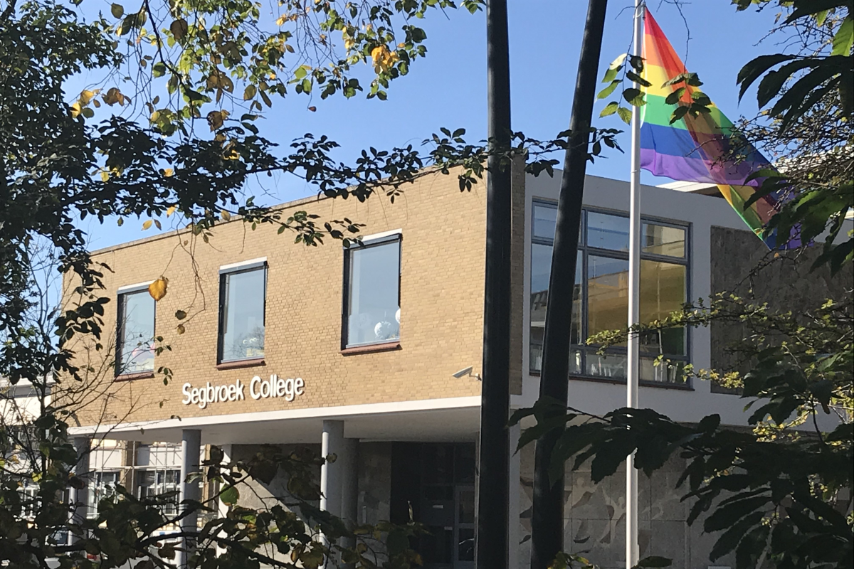 Het Segbroek College is een openbare school én een inclusieve school. Dat betekent dat iedereen welkom is, ongeacht je levensovertuiging, godsdienst of seksuele voorkeur. Zondag 11 oktober was het “Coming Out Day”. Op het Segbroek willen we laten zien dat iedereen op school zichzelf kan zijn. Daarom hebben we op maandag 12 oktober op beide locaties de regenboogvlag gehesen. Op vrijdag 11 december doen we dat trouwens nog een keer, want dan is het Paarse Vrijdag.