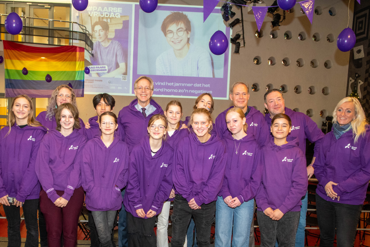 Vandaag kregen we bezoek van minister Robbert Dijkgraaf van Onderwijs, Cultuur en Wetenschap. Samen met onze leerlingen werd de regenboogvlag gehesen om Paarse Vrijdag in te luiden. Daarna volgde er een openhartig gesprek tussen de minister en de leerlingen over alles wat met acceptatie en jezelf zijn te maken heeft. Tot slot woonde de minister een les Beeldende Vorming bij, waarin leerlingen hun eigen buttons ontwierpen in het thema Love is Love. Het was een bijzonder begin van een bijzondere dag!